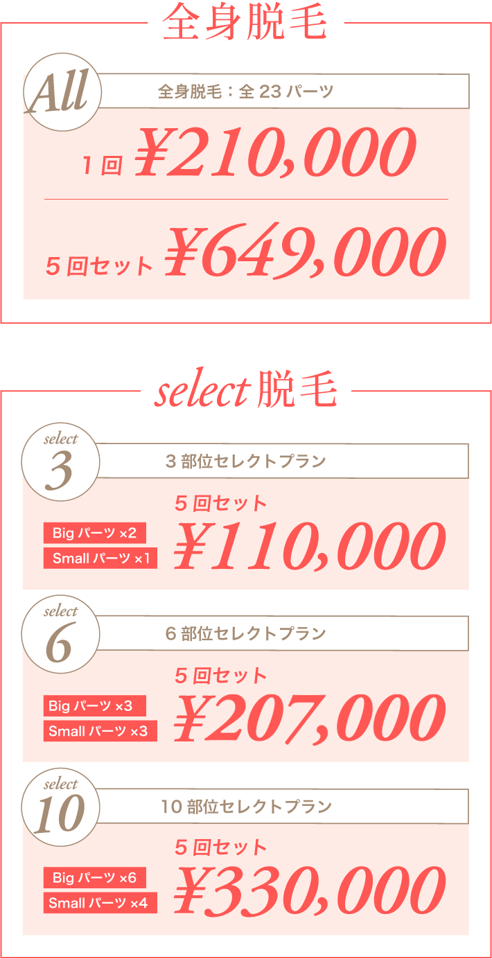 - 脱毛したい箇所を同時に選択することによって料金・時間が効果的になります。(最大40%オフ)