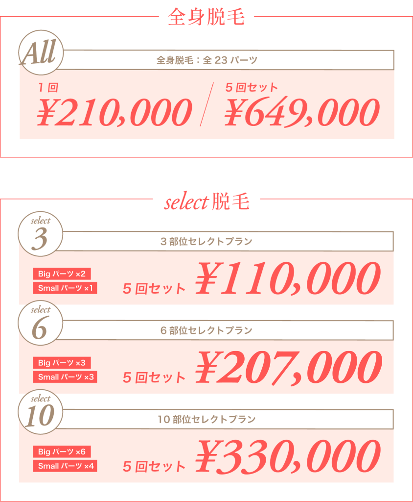 - 脱毛したい箇所を同時に選択することによって料金・時間が効果的になります。(最大40%オフ)